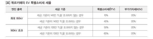 ÇÑÆí, Æ¢¸£Å°¿¹¿¡¼´Â ¸ðµç Â÷·® ±¸¸Å ½Ã ºÎ°¡°¡Ä¡¼¼(KDV)¿Í Ưº°¼Òºñ¼¼(ÖTV)ÀÇ Àû¿ëÀ» ¹Þ´Â´Ù. ¸ðµç EV ¸ðµ¨¿¡´Â 20%ÀÇ ºÎ°¡°¡Ä¡¼¼°¡ ºÎ°úµÇ¸ç, Ưº°¼Òºñ¼¼(ÖTV) ¼¼À²Àº Â÷·®ÀÇ ¿£Áø Ãâ·Â°ú ¼¼±Ý ±âÁØ¿¡ µû¶ó ´Ù¸£°Ô Àû¿ëµÈ´Ù. ¿¹¸¦ µé¾î, ¿£Áø Ãâ·ÂÀÌ ÃÖ´ë 160kWÀÌ°í ¼¼±Ý ±âÁØÀÌ 145¸¸ TLÀ» ÃʰúÇÏÁö ¾Ê´Â Àü±âÂ÷ÀÇ °æ¿ì ÖTV ¼¼À²Àº 10%·Î ¼³Á¤µÈ´Ù.