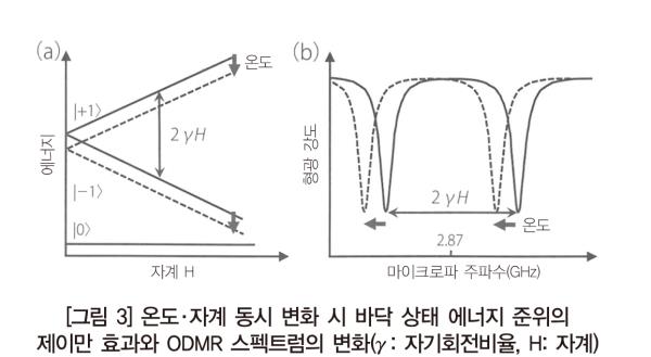 ÀÚ°è°¡ Àΰ¡µÇ¸é [±×¸² 3-(a)]¿¡¼ º¸µíÀÌ ‘Á¦À̸¸ È¿°ú(Zeeman effect)’·Î ¹Ù´Ú »óÅÂÀÎ ??ms=?±1>ÀÇ ¿¡³ÊÁö ÁØÀ§°¡ ??+1>°ú ??-1>·Î °¥¶óÁø´Ù. ÀüÀÚ½ºÇɰø¸íÀ» ÇÏ´Â Á֯ļöµµ °¥¶óÁø ÁØÀ§¿¡ ´ëÀÀÇØ µÑÀÌ µÇ±â ¶§¹®¿¡ [±×¸² 3-(b)]¿Í °°ÀÌ ODMR ½ºÆåÆ®·³Àº µÎ °÷¿¡¼ Çü±¤ °µµ°¡ ¶³¾îÁø´Ù. µÎ °ø¸í Á֯ļöÀÇ Â÷ÀÌ´Â ÀÚ°èÀÇ Å©±â¿¡ ºñ·ÊÇϹǷΠODMR·Î NV ¼¾ÅÍÀÇ ÀüÀÚ½ºÇÉÀÇ °ø¸í Á֯ļö¸¦ °èÃøÇϸé ÀÚ°è °èÃøÀ» ÇÒ ¼ö ÀÖ´Ù. ºñ·Ê»ó¼ö γ´Â ‘ÀÚ±âȸÀüºñÀ²’À̶ó°í Çϸç, ÀÚ°è °µµ¿¡ ¿µÇâÀ» ¹ÞÁö ¾Ê¾Æ ´Ù¾çÇÑ ÀÚ°è ¹üÀ§¿¡¼ °èÃøÇÒ ¼ö ÀÖ´Ù. ÇÑÆí, ¾çÀÚÀÇ Æ¯Â¡À» »ì·Á ‘Áßø(superposition)’ »óÅÂÀÇ À§»óÀ» ÀÐ°í ‘¾çÀÚ ¾ôÈû(entanglement)’ »óŸ¦ ÀÌ¿ëÇÏ¸é °¨µµ¸¦ Çâ»ó½Ãų ¼ö ÀÖ´Ù.