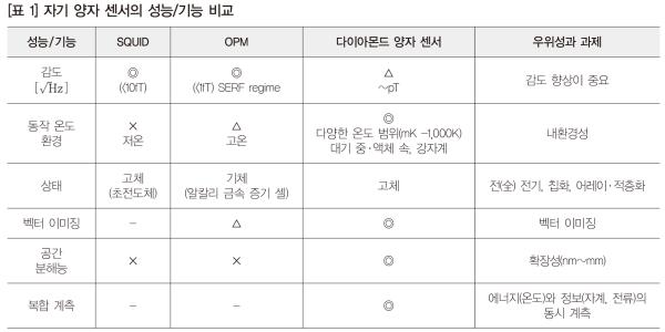 ÀÌ·¯ÇÑ Æ¯Â¡À» ´Ù¸¥ °í°¨µµ Àڱ⠼¾¼ÀÎ SQUID, ±¤ÆßÇÎ Àڷ°è(OPM)¿Í ºñ±³ÇÑ °ÍÀÌ [Ç¥ 1]ÀÌ´Ù. µ¿ÀÛ ¿Âµµ ȯ°æ, °ø°£ºÐÇØ´É, º¹ÇÕ °èÃø¿¡¼ ´ÙÀ̾Ƹóµå ¾çÀÚ ¼¾¼ÀÇ ¿ìÀ§¼ºÀÌ ÀÖ´Ù. ÀÚ°è¿Í ¿ÂµµÀÇ º¹ÇÕ °èÃø¿¡¼´Â [±×¸² 3-(b)]¿¡¼ º¸µíÀÌ ÀÚ°è´Â µÎ °ø¸í Á֯ļö°¡ °¥¶óÁö´Â ¹Ý¸é, ¿Âµµ´Â °ø¸í Á֯ļö°¡ À̵¿ÇÑ´Ù´Â Á¡¿¡¼ ÀÚ°è¿Í ¿Âµµ¸¦ µ¶¸³ÀûÀ¸·Î °áÁ¤ÇÒ ¼ö ÀÖ´Ù. ÀÌ´Â ÀÚ°è¿Í ¿Âµµ, Áï Á¤º¸¿Í ¿¡³ÊÁöÀÇ µ¿½Ã °èÃøÀÌ °¡´ÉÇÏ´Ù´Â °ÍÀ» º¸¿©ÁÖ¸ç, »ýü¿Í ¿¡³ÊÁö µð¹ÙÀ̽º¸¦ ¸ð´ÏÅ͸µÇÏ´Â µ¥ À¯¿ëÇÏ´Ù.