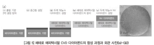 ½Ç¿ëȸ¦ À§Çؼ´Â ´ÙÀ̾Ƹóµå ±âÆÇÀÇ ´ë¸éÀûȰ¡ °úÁ¦Áö¸¸, À̸¦ ÇØ°áÇÒ ¿¬±¸µµ ÁøÇà ÁßÀÌ´Ù. [±×¸² 5]¿¡¼ º¸´Â ÇìÅ×·Î ¿¡ÇÇÅýþó CVD ±â¼úÀ» »ç¿ëÇØ ¾çÀÚ ¼¾¼¿¡ ¿ä±¸µÇ´Â ǰÁúÀÇ ´ÙÀ̾ƸóµåÃþÀ» ºñ(Þª) ´ÙÀ̾Ƹóµå ÀÌÁ¾ ±âÆÇ À§¿¡ Çü¼ºÇÏ´Â µ¥ ¼º°øÇß´Ù. °í°¡ÀÎ ´ÙÀ̾Ƹóµå Á¾ °áÁ¤°ú ºñ±³ÇØ ¸éÀûÀÌ ³ÐÀº ºñ ´ÙÀ̾Ƹóµå ±âÆÇÀ» »ç¿ëÇϱ⠶§¹®¿¡ °ø¾÷Àû ¾ç»ê¼ºÀÇ °¡´É¼ºÀÌ ÀÖ´Ù.