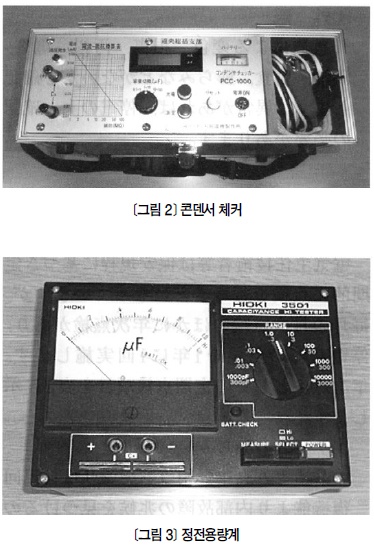 Á¤¹ÐÁ¡°ËÀº Äܵ§¼ ³»ºÎ °íÀåÀ¸·Î ¼Õ½ÇµÈ Á¤Àü¿ë·®ÀÇ Â÷À̸¦ ÃøÁ¤ÇØ Áø´ÜÇÑ´Ù. ÃøÁ¤±â´Â ÁÖ·Î Äܵ§¼ üĿ, Á¤Àü¿ë·®°è¸¦ »ç¿ëÇÑ´Ù(<±×¸² 2, 3> ÂüÁ¶). Á¤Àü¿ë·®Àº Á¤°ÝÄ¡ÀÇ -5%~+15% À̳»·Î ÇÑ´Ù. ¶ÇÇÑ Ãʱ⠰ªÀ» ÃøÁ¤ÇÏ¸é ±4% À̳»¸¦ Á¤»ó ±âÁØÀ¸·Î ÇÑ´Ù. ÇÑÆí, Äܵ§¼ üĿ´Â ³»ºÎ ¹æÀüÀúÇ×ÀÇ ÁÁ°í ³ª»ÝÀ» Áø´ÜÇÏ´Â µ¥µµ À¯È¿ÇÏ´Ù.