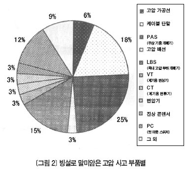 ´« ÇÇÇØ »ç°í ½ÇÅ ÀϺ» ȪīÀ̵µÀü±âº¸¾ÈÇùȸ¿¡¼ ¼öŹ °è¾àÀ» ¸ÎÀº ¼ö¿ë°¡(ÀÚ°¡¿ë Àü±â °øÀÛ¹°) Áß °í¾Ð »ç°í´Â 2002³âºÎÅÍ 2006³â±îÁö ¿¬Æò±Õ 143°Ç ¹ß»ýÇßÀ¸¸ç, ±×Áß ºù¼³Þ¼àäÀÌ ¿øÀÎÀÎ °æ¿ì°¡ 6.6°ÇÀÌ´Ù. ºù¼³·Î ¸»¹Ì¾ÏÀº ÆÄ±Þ »ç°í´Â 2003³â 2°ÇÀÌ ÀÖ¾ú´Ù(<Ç¥ 1> ÂüÁ¶). ÀÌ ½Ã±â¿¡ ºù¼³·Î ¹ß»ýÇÑ °í¾Ð ¼öº¯Àü ¼³ºñ »ç°í¸¦ ºÎǰº°·Î Áý°èÇÏ°í ºñÀ²·Î ³ªÅ¸³½ °ÍÀÌ <Ç¥ 2>¿Í <±×¸² 2>´Ù. °í¾Ð °¡°ø¼±, ÄÉÀÌºí ´Ü¸», ÁÖ»ó ±âÁß °³Æó±â(PAS) µî ¿Á¿Ü ±â±âÀÇ »ç°í ¹ß»ý °Ç¼ö´Â 16°Ç(49%)À̸ç, LBS µî ¿Á³» ±â±âÀÇ »ç°í¹ß»ý °Ç¼ö´Â 17°Ç(51%)À¸·Î ¿Á¿Ü¿Í ¿Á³» »ç°íºñÀ²Àº °ÅÀÇ ºñ½ÁÇÏ´Ù. »ç°í ³»¿ëÀ» »ìÆìº¸¸é ½×ÀÎ ´« ¹«°Ô·Î ¸»¹Ì¾ÏÀº ´Ü¼±, ¾ÖÀÚ µî Àý¿¬¹°ÀÇ Àý¿¬ ÀúÇÏ·Î ¸»¹Ì¾ÏÀº Áö¶ô, »ó°£ ´Ü¶ôÀÌ ´ëºÎºÐÀ» Â÷ÁöÇÑ´Ù.