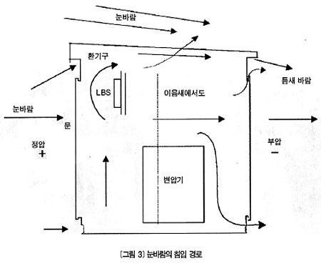 ´« ÇÇÇØ ¹ß»ý ±¸Á¶ ¸ô¾ÆÄ¡´Â ´«£ü¿À´Ã³¯ ¼öº¯Àü ¼³ºñ´Â ¹èÀü¹Ý ÇüŰ¡ ÁÖ·ù¸¦ ÀÌ·ç¸ç, ¿Á¿Ü´Â ¼³Ä¡ ȯ°æ¿¡ µû¶ó ´«ÀÇ ¿µÇâÀ» ¹Þ±â ½±´Ù. ¿Á¿Ü¿¡ ¼³Ä¡ÇÏ´Â ¹èÀü¹ÝÀÇ °æ¿ì, ¹Ù±ù °ø±â°¡ °í¼ÓÀ¸·Î È帣¸é º£¸£´©ÀÌÀÇ Á¤¸®(Bernoulli's theorem)¿¡ ÀÇÇØ ³»ºÎ´Â ´ë±â¾Ðº¸´Ù ³·Àº ºÎ¾ÐݶäâÀÌ µÈ´Ù. ÀÚµ¿Â÷¸¦ ¿îÀüÇÒ ¶§ â¹®À» Á¶±Ý ¿¾îµÎ¸é ´ã¹è ¿¬±â°¡ ¹Ù±ùÀ¸·Î ³ª°¡´Â °Í°ú °°Àº ÀÌÄ¡´Ù. ÀÌ·¯ÇÑ ³í¸®´Â <±×¸² 3>°ú °°Àº ¿Á¿Ü ¹èÀü¹Ý¿¡µµ Àû¿ëµÈ´Ù. ¹Ù¶÷ÀÌ °Å¼¾ ³¯ ¿Á¿Ü ¹èÀü¹Ý¿¡ ¹Ù¶÷ÀÌ ´ê´Â ¸éÀº ¹Ù¶÷ÀÌ °¡·Î¸·Çô ±â¾ÐÀÌ ¿Ã¶ó°¡°í(Á¤¾Ð), ±×´ÃÀÌ Áø ¹Ý´ëÆíÀº °ø±â¸¦ ³»º¸³»±â¿¡ ºÎ¾ÐÀÌ µÈ´Ù. ÀÌ »ó½Â È¿°ú·Î ºÎ¾ÐºÎºÐÀº °ø±â¸¦ ³»º¸³»°í Á¤¾Ð ºÎºÐÀº °ø±â°¡ À¯ÀÔµÊÀ¸·Î½á À̶§ ´«ÀÌ ÇÔ²² ¾ÈÀ¸·Î ¸ô¾ÆÄ¡´Â Çö»óÀÌ ¹ß»ýÇÑ´Ù. ¿ÏÀüÈ÷ ¹ÐÆóµÈ ±¸Á¶¶ó¸é ºÎ¾Ð, Á¤¾Ð°ú´Â ¹«°üÇÏ°Ô °ø±â ÈíÃâÀÌ ¾ø¾î ´«ÀÌ µéÀÌ´ÚÄ¡´Â »óȲµµ »ý±âÁö ¾Ê´Â´Ù. ±×·¯³ª ¹èÀü¹Ý¿¡´Â ȯ±â¸¦ À§ÇÑ È¯±â±¸¸¦ ¿ ´ëÃ¥À¸·Î ¹Ýµå½Ã ¼³Ä¡ÇÑ´Ù. ¿©±â¿¡ ¹®ÀÌ ºñ¶Ô°Å³ª ÆÇ¸é÷ùØüÀ» ¿¬°áÇÏ´Â °úÁ¤¿¡¼ ¾ÆÁÖ Á¼Àº Æ´»õ°¡ »ý±æ ¼ö ÀÖÀ¸¸ç, ÀÌ Æ´»õ·Î ¹Ù¶÷ÀÌ ºÎ´Â ¿ø¸®¸¦ µû¶ó ´«µµ ¾ÈÀ¸·Î µé¾î¿À°Ô µÈ´Ù. ÇÑÆí, ¼³Ä¡ ȯ°æµµ ²À °í·ÁÇØ¾ß ÇÑ´Ù. °°Àº ±â»ó Á¶°Ç¿¡¼µµ ´«ÀÌ ¸ô¾ÆÃÄ ´« ÇÇÇØ¸¦ ÀÔ´Â ¼³Ä¡ Á¶°ÇÀÌ ÀÖÀ¸¸ç, ¹èÀü¹Ý ±¸Á¶¿¡ °ü°è¾øÀÌ ¿µÇâÀ» ¹ÞÁö¾Ê´Â ¼³Ä¡ Àå¼Ò°¡ Á¸ÀçÇÑ´Ù. ƯÈ÷ ºôµù ¿Á»ó¿¡ ¼³Ä¡ÇÏ´Â ¹èÀü¹ÝÀº ºôµùdz(Building Wind)ÀÇ ¿µÇâÀ¸·Î ¼³Ä¡ Àå¼Ò¿¡ µû¶ó dz¼Ó, dzÇâ µîÀÌ ¹Ù²ï´Ù. ÁöÇü µî ¸ðµç Á¶°Ç¿¡¼ ¸¶Âù°¡Áö´Ù. ¿¹¸¦ µé¾î ºí¸®ÀÚµåBlizzard°¡ ÀÚÁÖ ¹ß»ýÇÏ´Â Áö¿ªÀ̳ª Àå¼Ò°¡ Àֱ⠸¶·ÃÀ̸ç, ±×¿¡ µû¸¥ °³º° ´ëÀÀÀÌ ÇÊ¿äÇÏ´Ù.