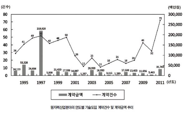 1994³âºÎÅÍ 2011³â±îÁöÀÇ ºÐ¾ßº° ±â¼ú µµÀÔ ¼¼ºÎ »çÇ×À» ¾Ë¾Æº¸¸é ¼³°è ¹× ¿£Áö´Ï¾î¸µ ºÐ¾ß°¡ Àüü ±â¼ú µµÀÔ°Ç Áß 23.5%¸¦ Â÷ÁöÇØ °¡Àå ¸¹ÀÌ µµÀÔÇÑ ºÐ¾ß·Î ³ªÅ¸³µÀ¸¸ç, ¿øÀü¿î¿µ ¹× Á¤ºñºÐ¾ßÀÇ ±â¼ú µµÀÔÀÌ 21.5%·Î µÎ ¹øÂ° ¸¹ÀÌ µµÀÔÇÑ ºÐ¾ß·Î ³ªÅ¸³µ´Ù. 2011³âµµ ±â¼ú µµÀÔ ºÐ¾ß¸¦ »ìÆìº¸¸é ¼³°è ¹× ¿£Áö´Ï¾î¸µ ºÐ¾ß°¡ 35°ÇÀ¸·Î ÁÖ·Î APR1400 ¼³°è°ü·Ã ±â¼ú µµÀÔÀ̸ç, ¿øÀÚ·Î ¾ÈÀü¼º °³¼± ºÐ¾ß°¡ 9°Ç ¿øÀü¿¬·á Á¦Á¶ ¹× °ü·Ã±â¼ú ºÐ¾ß 6°Ç, ¿øÀü¿î¿µ ¹× Á¤ºñ ºÐ¾ß 5°Ç µîÀ¸·Î ±â¼ú µµÀÔÀÌ ÀÌ·ïÁø °ÍÀ¸·Î ³ªÅ¸³µ´Ù.